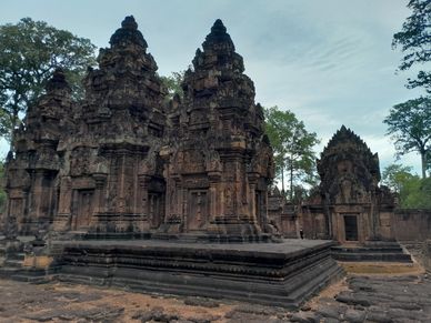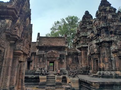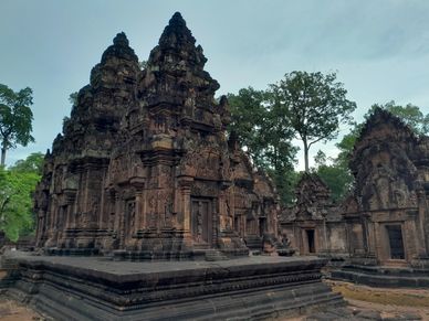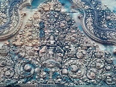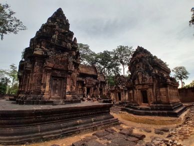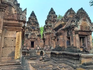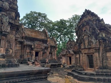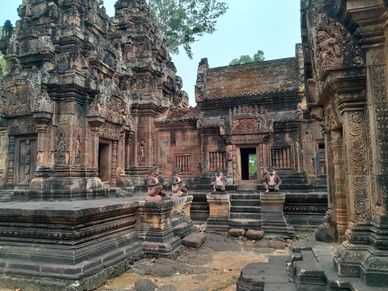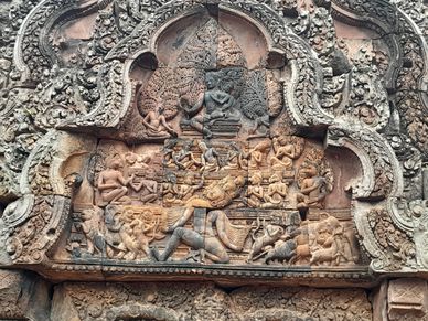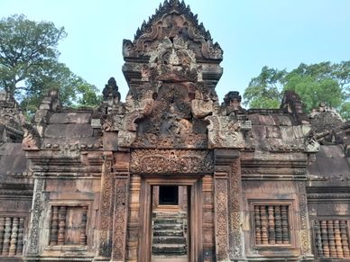 Banteay Srei is built largely of red sandstone, a medium that lends itself to the elaborate decorative wall carvings which are still observable today.