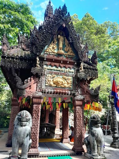 Banteay Srei is a 10th century CE Cambodian temple dedicated to the Hindu gods Shiva and Parvati. Located in the area of Angkor, it lies near the hill of Phnom Dei, 25 km (16 mi) north-east of the main group of temples that once belonged to the medieval capitals of Yaśodharapura and Angkor Thom.