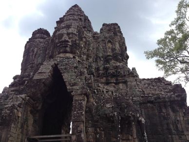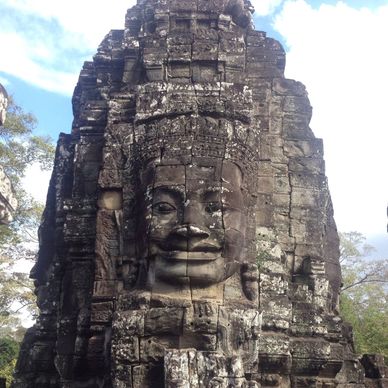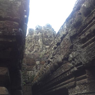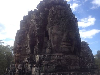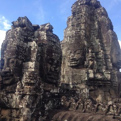 The Bayon Temple, located in Angkor Thom, Cambodia, has 216 huge stone faces carved on its towers. These faces are a distinctive feature of the temple and are often depicted as smiling. The temple has a total of 54 towers (believed to be each created for 54 major cities in the kingdom), with each tower having four faces.